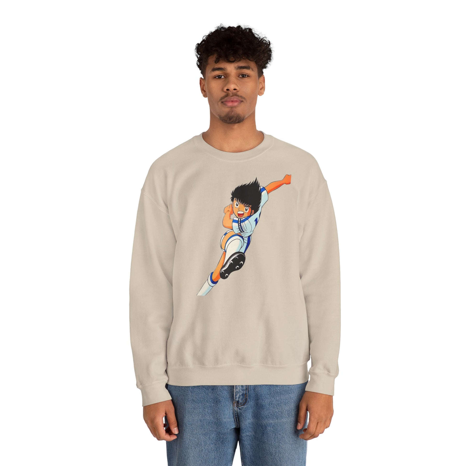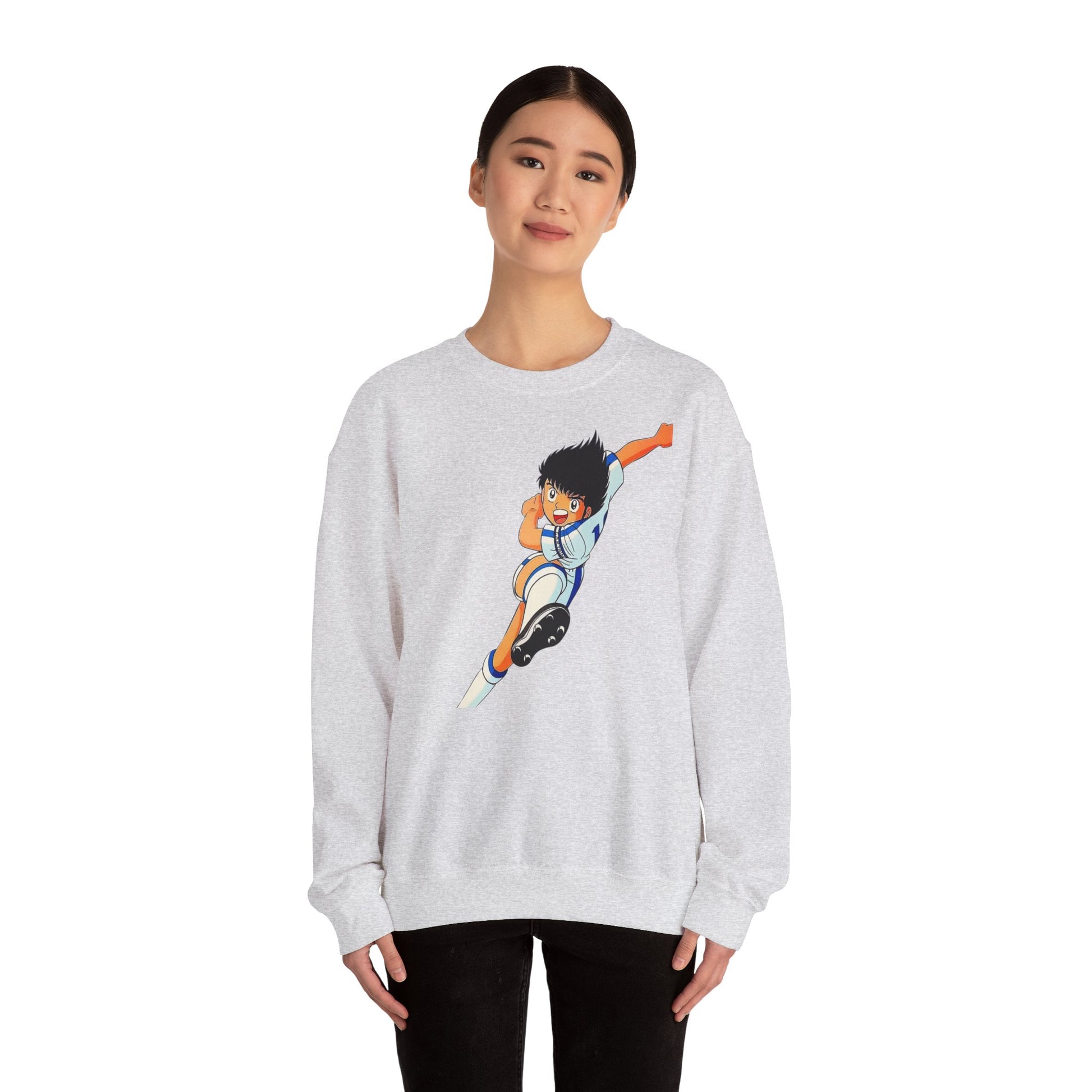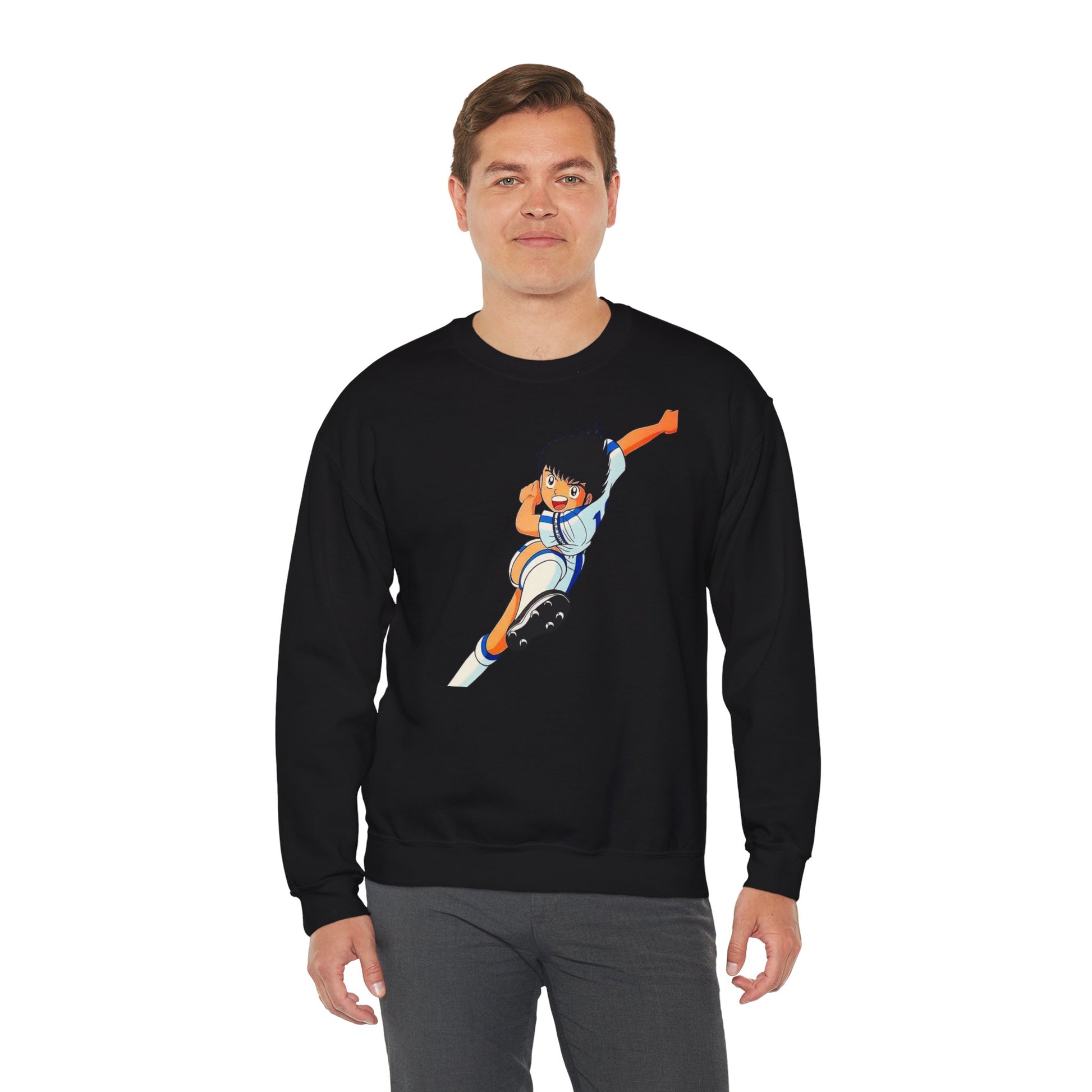 This cozy crewneck brings playful anime energy to everyday wear. The mid-weight blend and classic fit keep you warm without weighing you down, while the bright, action-packed illustration adds a youthful, sporty pulse to your outfit. Wear it on game nights, casual weekends, or whenever you want to nod to nostalgia and animated heroes — it layers easily under a jacket and pairs well with jeans or joggers. The soft tear-away label and ribbed collar keep comfort front and center, while durable double-needle stitching means it stands up to regular wear.
