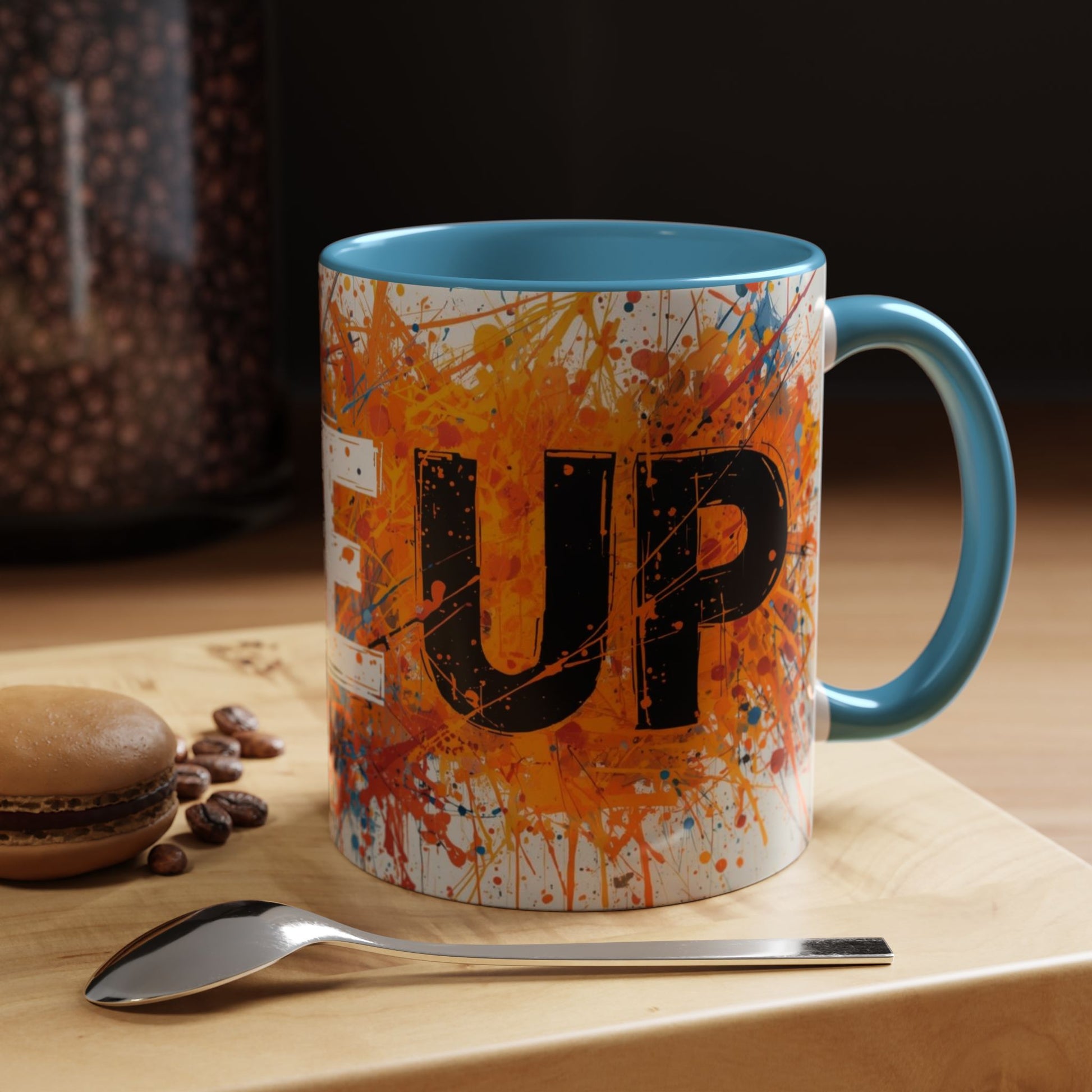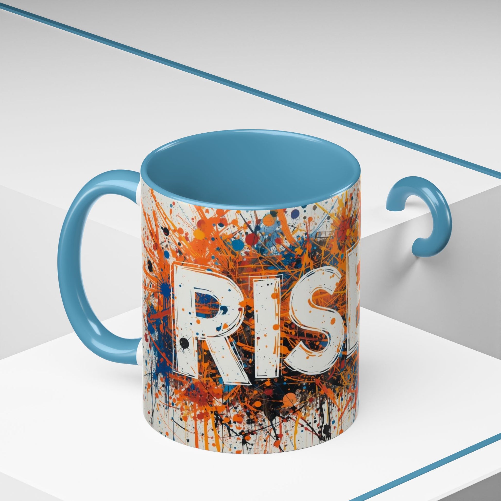 This vibrant ceramic mug brings bold energy to morning routines and creative workspaces. Bright splashes of orange, blue and black form an expressive, paint-splatter background around strong, stenciled lettering, while the colored interior and C‑shaped handle add a striking contrast. The glossy finish makes colors pop, and the sturdy ceramic body holds either 11 oz or 15 oz of your favorite coffee, tea, or cocoa. It stands out on a cluttered desk, cheers up a slow morning, and fits seamlessly into studios, offices, and kitchen shelves where color and attitude matter.